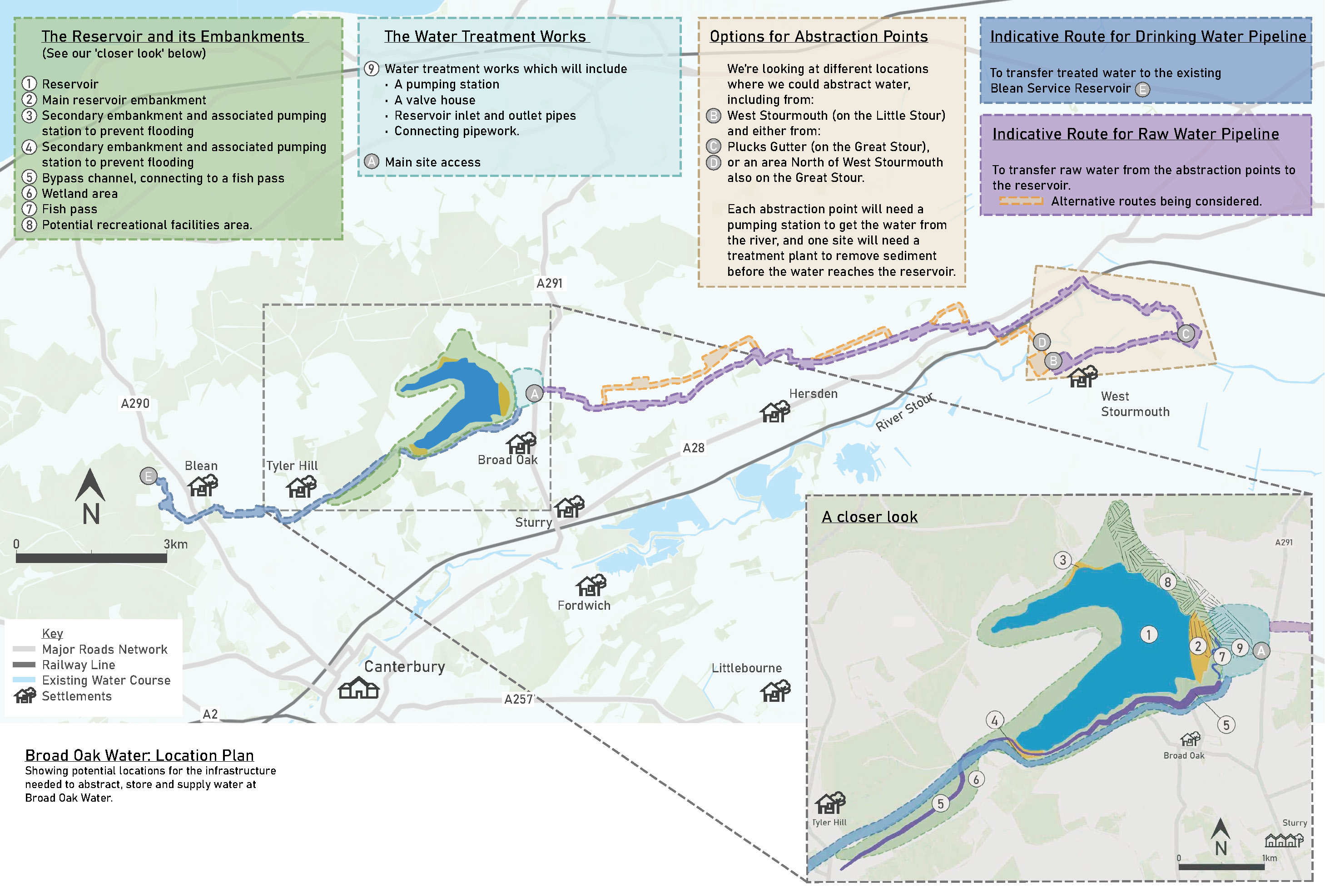 The plan below shows the location of the proposed site in relation to Canterbury and locations for the infrastructure needed to abstract, store and supply water at Broad Oak:
